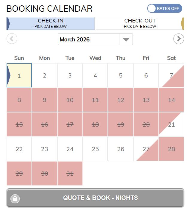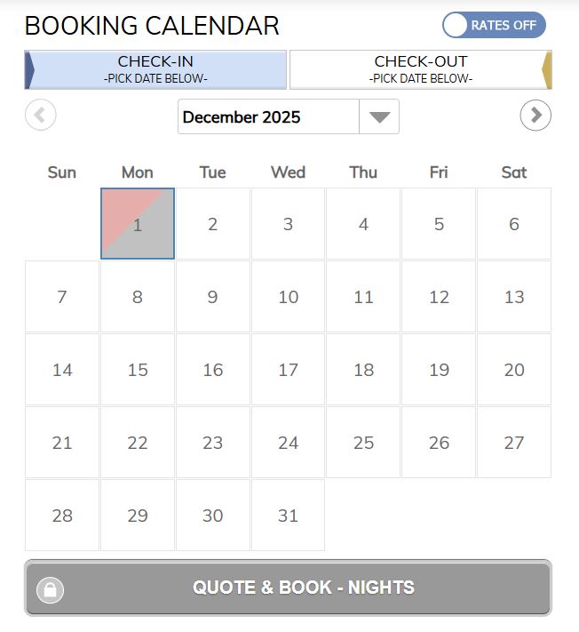 Check Availability To check availability choose your check-in and check-out dates by clicking them on the vacation rental calendar below. You can also turn “Rates On” to see rates for the dates that you want to book.
